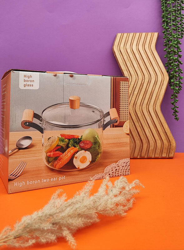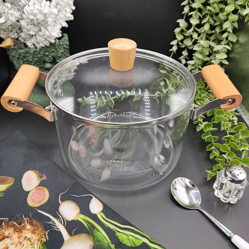قابلمه پیرکس ( شیشه بوروسیلیکات ) 3500میلی لیتری دسته چوبی با پوشش ایمن و مقاوم. دهانه بزرگتر برای دسترسی به مواد تشکیل دهنده غذا. بسیار شفاف و شعله مستقیم.