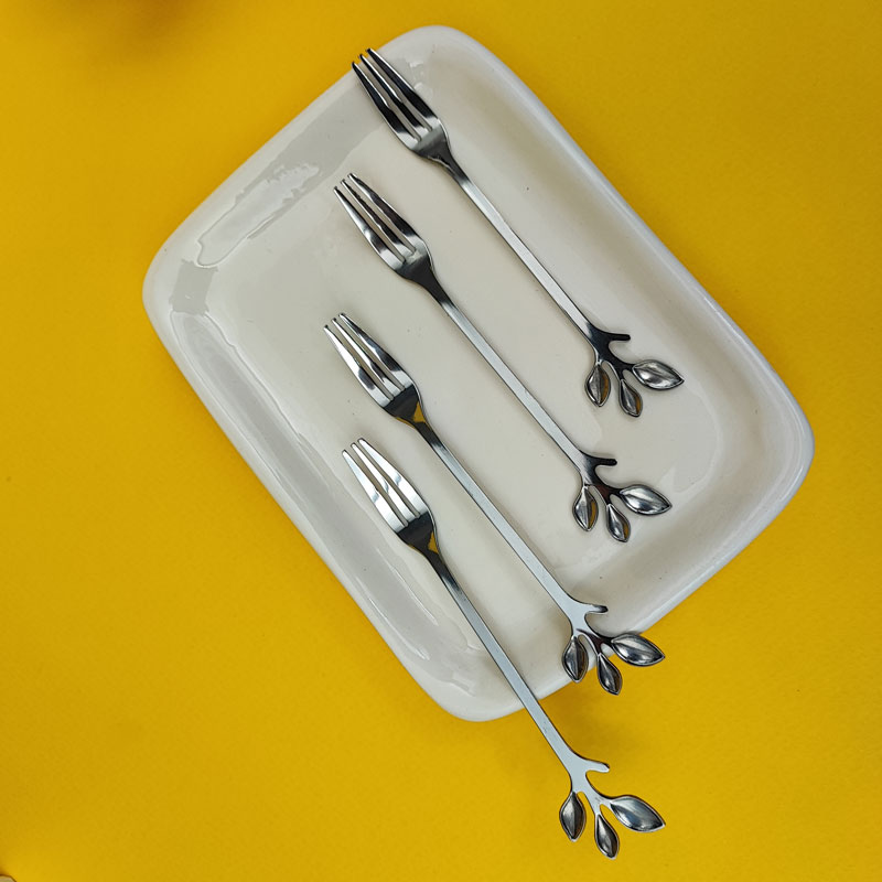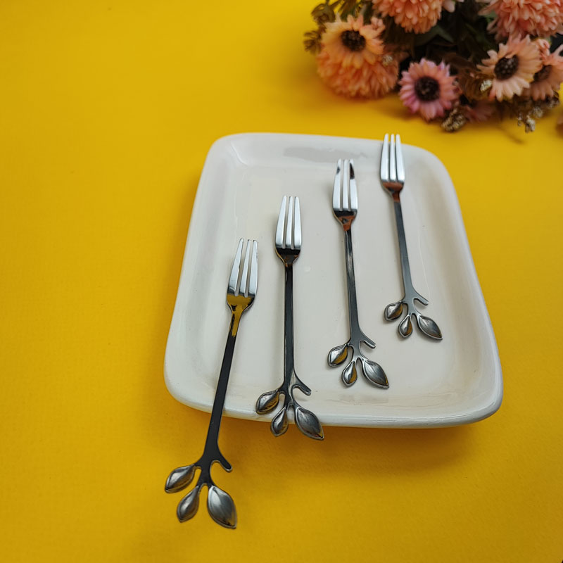 چنگال کیک و زیتون خوری استیل رنگ ثابت و ضدزنگ با طرح زیبای برگ دارای کیفیت عالی و قیمت مناسب. شیک و زیبا. زینت بخش میز پذیرایی شما. قیمت محصول، برای یک دست می باشد.